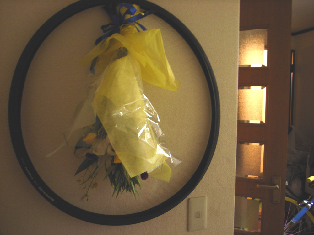 持ち帰った後はドライフラワーにすべく玄関先に吊るして乾かしてます花束、とタイヤ。